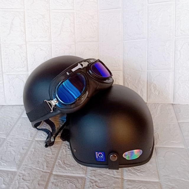 Sản phẩm gồm 1 mũ bảo hiểm nửa đầu đen trơn, tằng kèm kính phi công 7 màu rất đẹp.