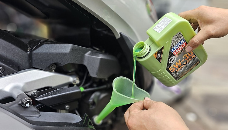 - Bước 3: Đổ chai "Dầu nhớt Molygen 5W30 (hoặc 10W40)" vào bình nhớt xe máy theo tỉ lệ của từng loại xe (thường là 800ml, tức dư 200ml để giành)