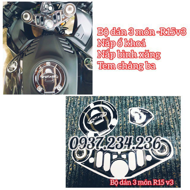 Mô tô, xe máy > Phụ kiện xe máy > Hình dán, logo, huy hiệu || Bộ tem dán R15 v3 - 3 món - tem chảng ba/nắp ổ khoá/ nắp bình xăng