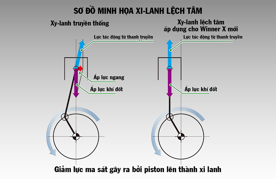 Động cơ PGM-FI trên WINNER R được tối ưu với hàng loạt công nghệ giảm ma sát như xi-lanh lệch tâm, váy piston phủ molybdenum với vân thô, cò mổ con lăn và ống lót xi-lanh đặc biệt. Nhờ đó, xe vừa đạt công suất mạnh mẽ vượt trội vừa tối ưu khả năng tiết kiệm nhiên liệu.